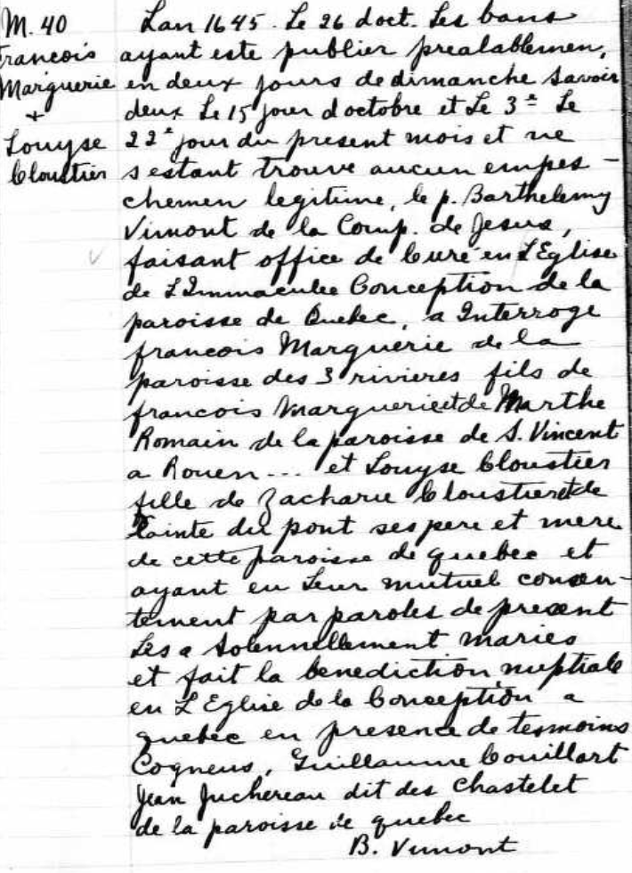 Six months after her husband passed, Marie Louise married a soldier who immigrated from Paris. Later, he became a farmer and a tailor. Jean Migneault Chatillon and Marie Louis married on 10 Nov 1648. The couple had thirteen children.
