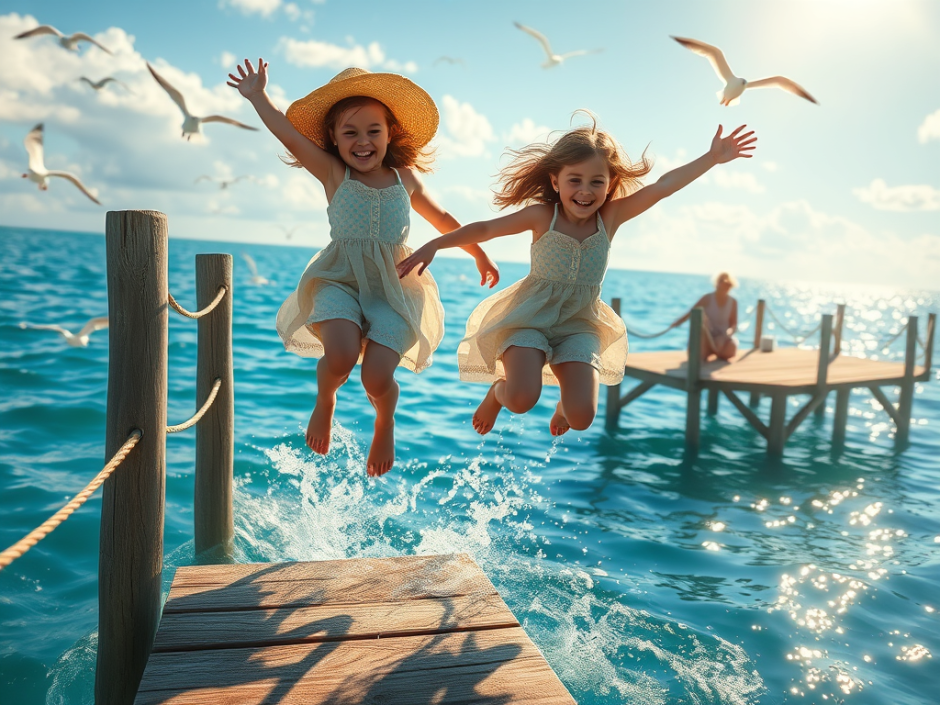 Running to the end of the pier, the two girls giggled with delight. The sun shimmered on the bay, casting a harsh glare, and Amy wished she had brought her sunglasses. Barb’s large straw hat shielded her face, but she still worried about new freckles appearing across her cheeks and the bridge of her nose. Seagulls squawked in protest and flapped away from the pier’s edge as the girls approached. With a shared grin, they kicked off their flip-flops, Barb dropped her hat, and the pair leaped into the cool, inviting water.