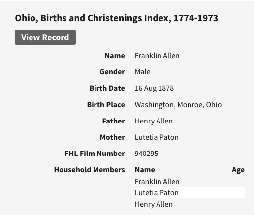 Birth 16 Aug 1878 • Washington, Monroe, Ohio