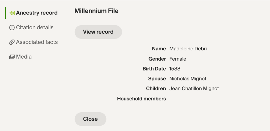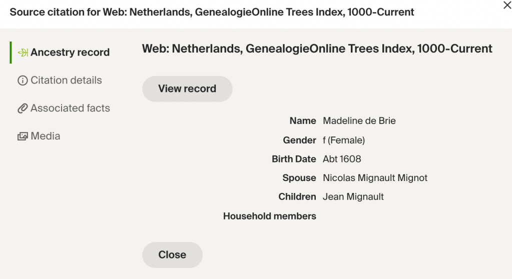 Citation”Canada, Québec naissances et baptêmes, 1662-1898″, database, FamilySearch (https://familysearch.org/ark:/61903/1:1:F2CG-424 : 9 February 2020), Marguerite Gaboury, 1680.