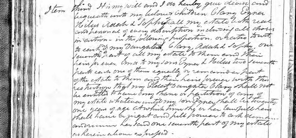 Item third–It is my will and I do hereby give devise and bequeath unto my beloved children Clary, Ezner, Hilus, Adah, and Sophy all my estate both real and personal of every description in.?..all..?.in..?.in the following proportion or ratio to wit to each one of my Daughters, Clary, Adah & Sophy, one seventh part of all my estate to them and their heirs for ever. And to my sons