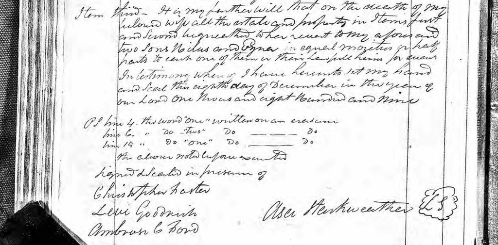 Item third–It is my further will that on the death of my beloved wife all the estae and property in Items first and second bequeathed to her went to my aforesaid two sons Hilus and Ezner in equal..?.. of half parts to each one of them or their lawful heirs forever. In testimony where of I have hereinto let my hand and seal this eighth day of December in the year of our Lord one thousand eight hundred and nine.