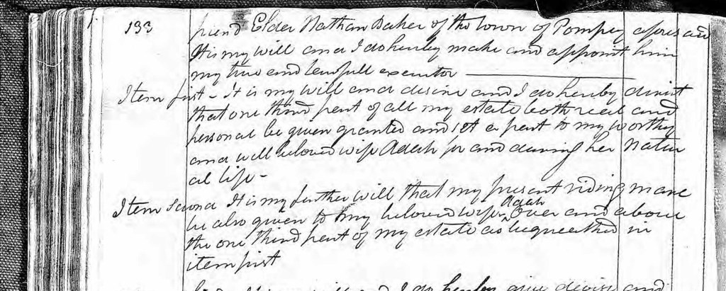 First reposing special trust & confidence in my trusty friend Elder Nathan Baker of the Town of Pompey aforesaid. It is my will and I do kindly make and appoint him my true and lawful executor.