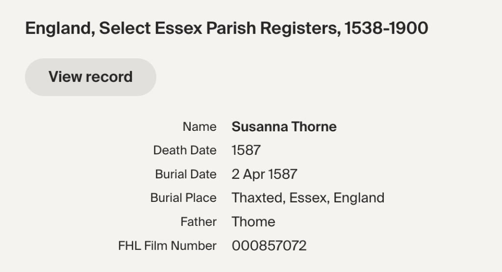 - “Essex, England, Select Church of England Parish Registers, 1518-1960.” Ancestry®, 2014, http://www.ancestry.com/search/collections/9850/.