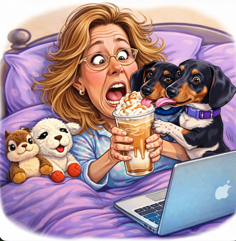 My Muttley Crew eyes my coffee with the cunning of caffeine-obsessed spies, scheming to steal every single drop. They inch closer. Happy wriggling bodies ready to devour my whipped cream. As they advance, a pair of daring tongues dart toward my mug. Suddenly, my literary hopes evaporate. I become a pajama-clad sentry, protecting my mug like it’s a matter of survival, and honestly, it just might be.